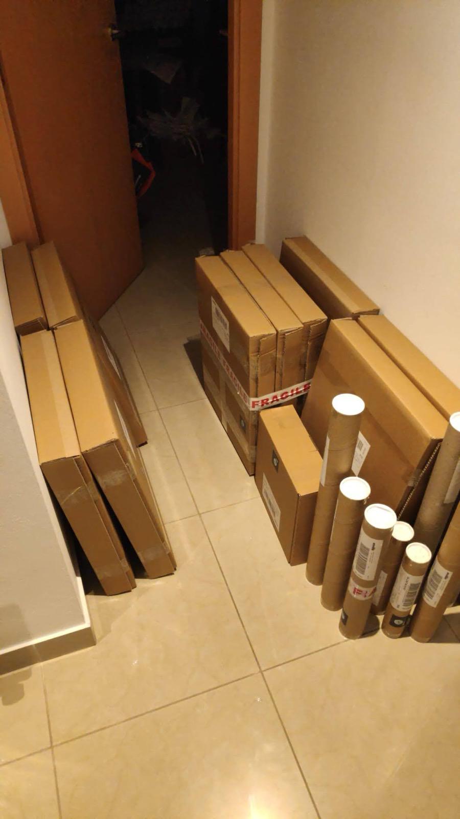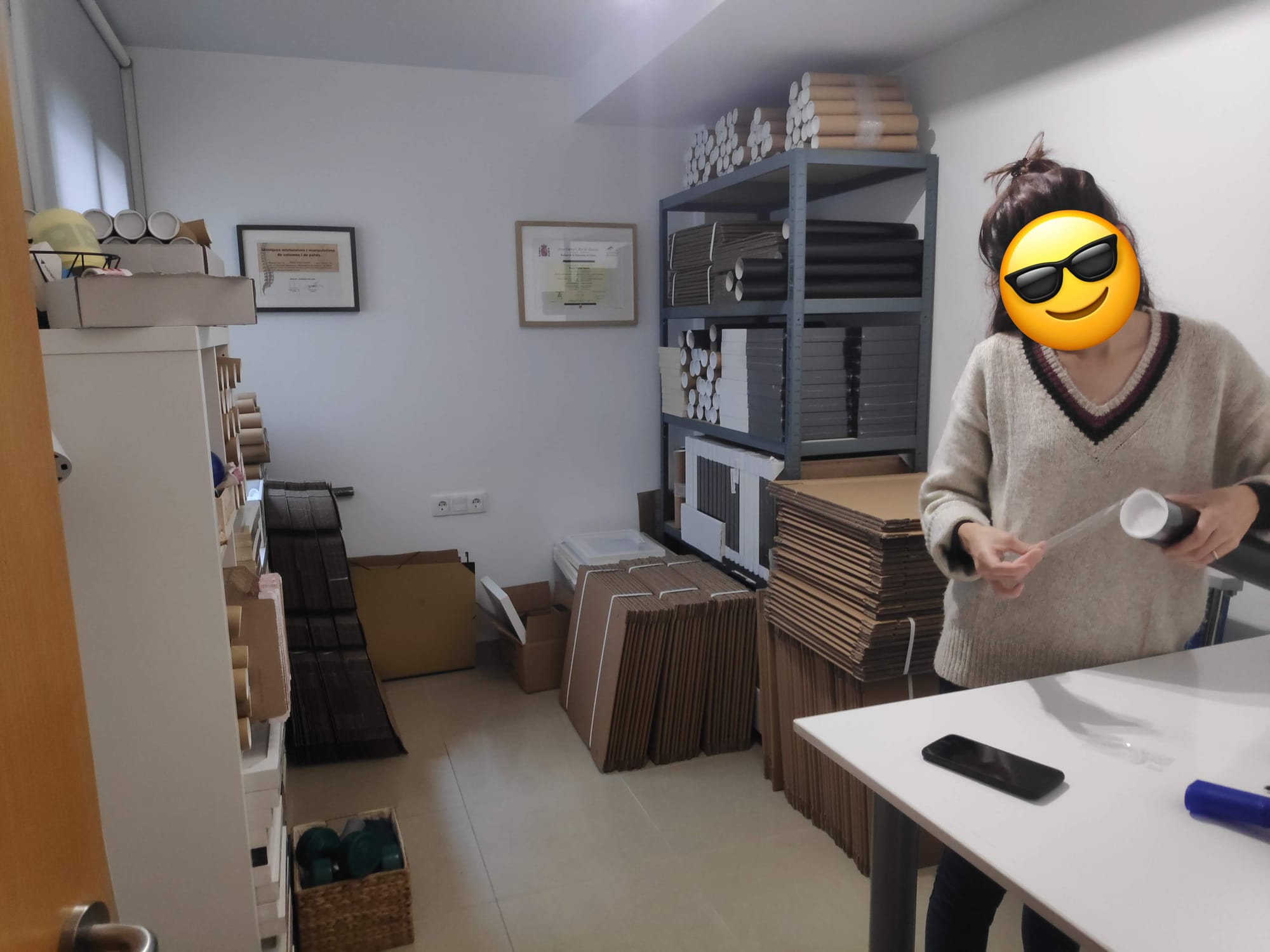 En aquel entonces teníamos una habitación de nuestro piso dedicada íntegramente al proyecto, con una mesa elevada para preparar los pedidos, estanterías llenas de cajas, tubos, marcos... En las semanas con más movimiento del año (Black Friday y Navidad) tenían que venir mi hermana y mi cuñado a ayudarnos a preparar pedidos, porque era inviable que nosotros solos pudiéramos sacar tantos paquetes de un día para otro. Al fin y al cabo, cada pedido requiere: