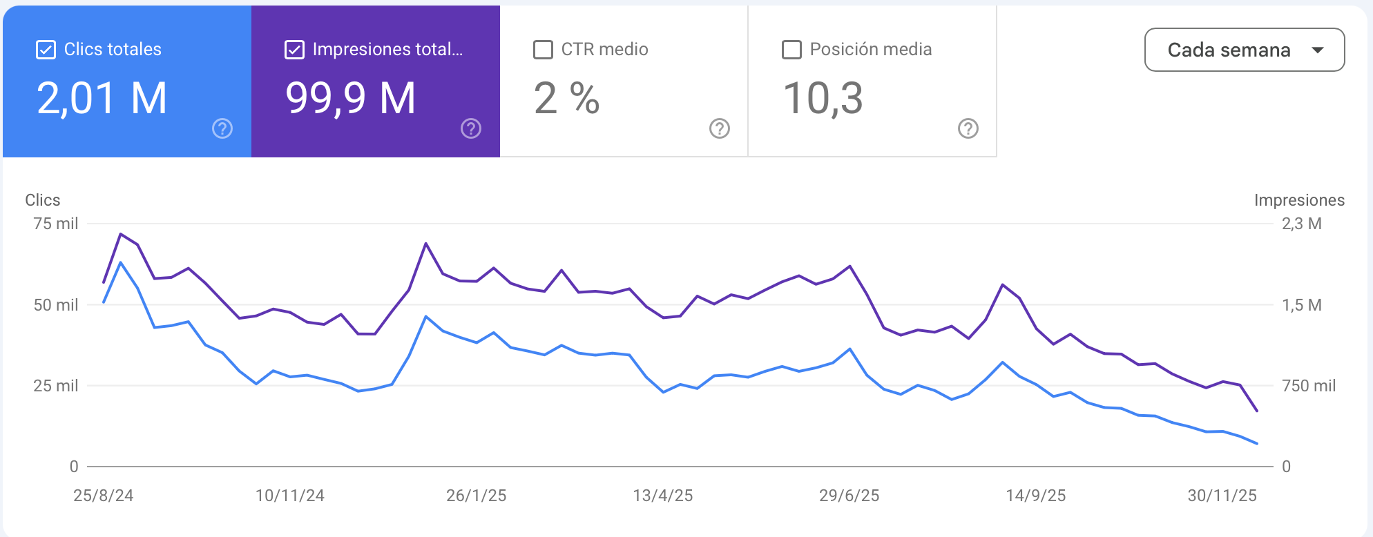 No es cosa de un Core Update puntual, ni tan siquiera de este último de la semana pasada, porque la sangría de ir perdiendo tráfico viene de lejos, pero parece evidente que a Google ya no se la cuelas con contenido regulero.